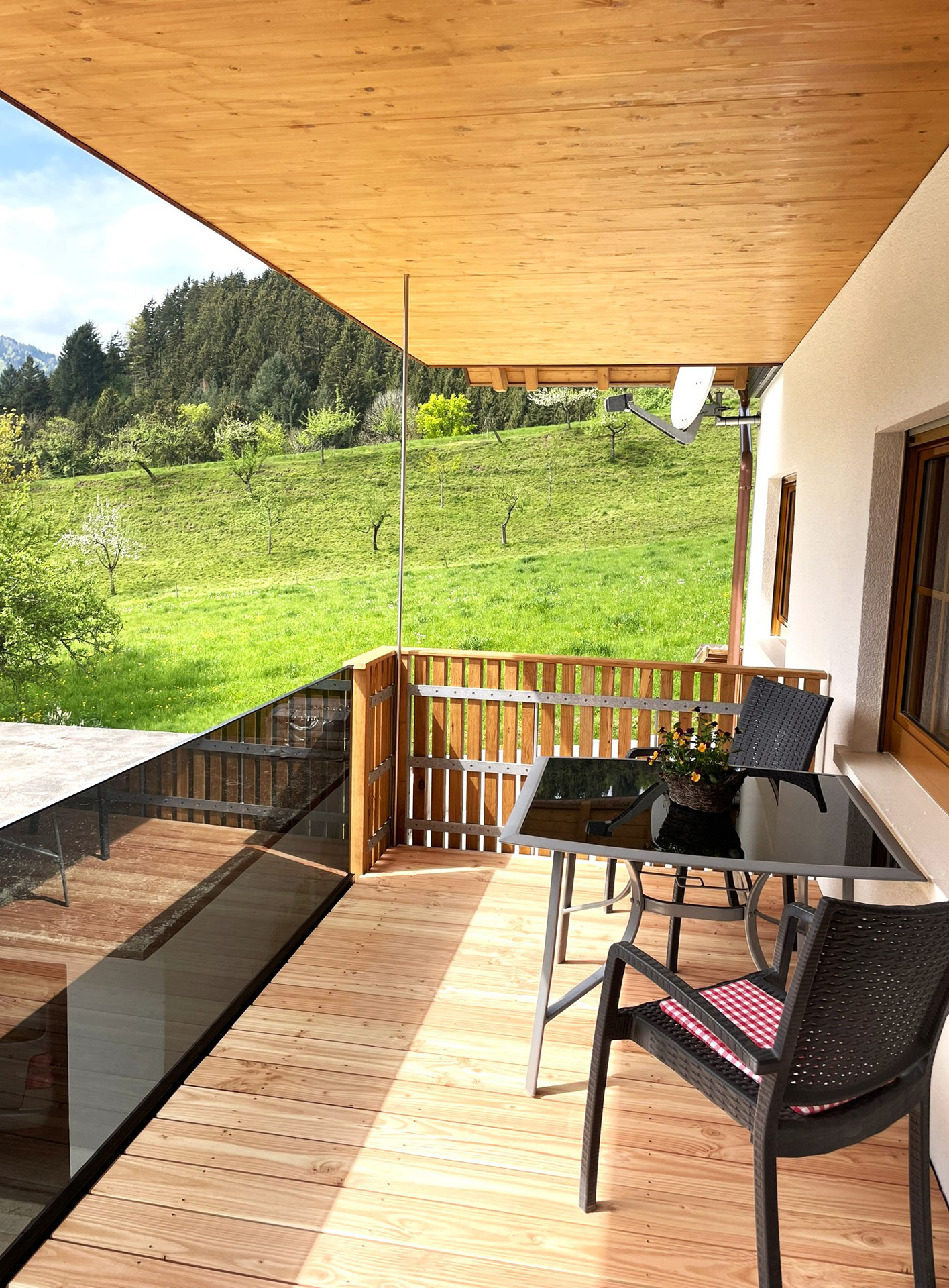 Mit einem großzügigen Balkon ausgestattet, bietet die Wohnung nicht nur einen atemberaubenden Blick in das Tal und die imposante Schwarzwaldkulisse, sondern lädt auch dazu ein, entspannt den Tag bei einem Glas Wein oder einer Tasse Kaffee zu genießen. Der offene Raum und die liebevolle Gestaltung sorgen dafür, dass Sie sich sofort wohlfühlen – ob beim Entspannen oder beim gemeinsamen Kochen und Genießen.